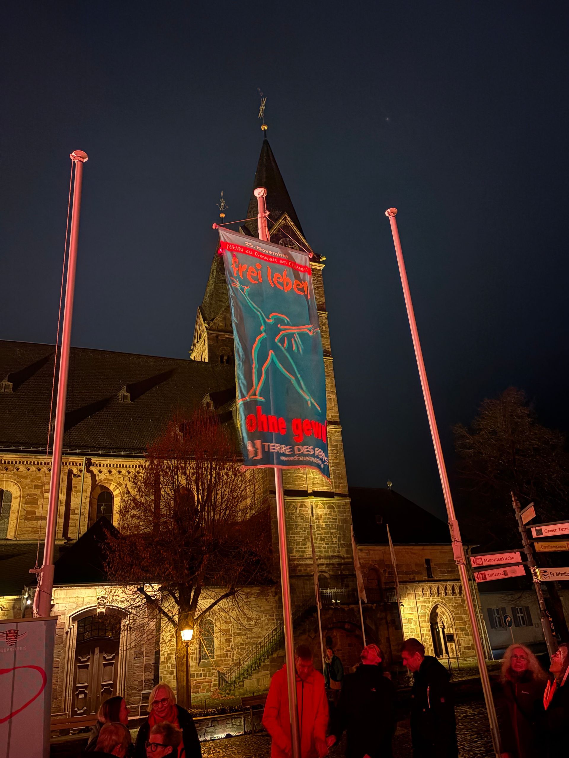 Am 25. November 2024 haben Dagmar Becker und Maria Weber vom Frauennetzwerk gemeinsam mit den Mitarbeiterinnen des Frauen- und Gleichstellungsbüros und rund 50 engagierten Frauen und Männern ein deutliches Zeichen gegen Gewalt an Frauen gesetzt. Unter dem Motto „Frei leben, ohne Gewalt“ trafen wir uns in Wasenberg im südlichen Schwalm-Eder-Kreis, um unsere Solidarität zu zeigen und auf dieses wichtige Thema aufmerksam zu machen. Die Veranstaltung wurde durch Bürgermeister Luca Fritsch eröffnet. Im Anschluss sprach Bärbel Spohr vom Frauen- und Gleichstellungsbüro über die Bedeutung des Mottos und der Veranstaltung. Danach begrüßte Maria Weber die Anwesenden im Namen des Frauennetzwerk Schwalm-Eder e.V. und stellte kurz unsere Arbeit und Ziele vor. Gemeinsam mit unserem Transparent haben wir ein starkes, sichtbares Zeichen gegen Gewalt an Frauen gesetzt. Die gelungene Veranstaltung zeigte, wie wichtig und kraftvoll ein gemeinsames Engagement in der Region ist.