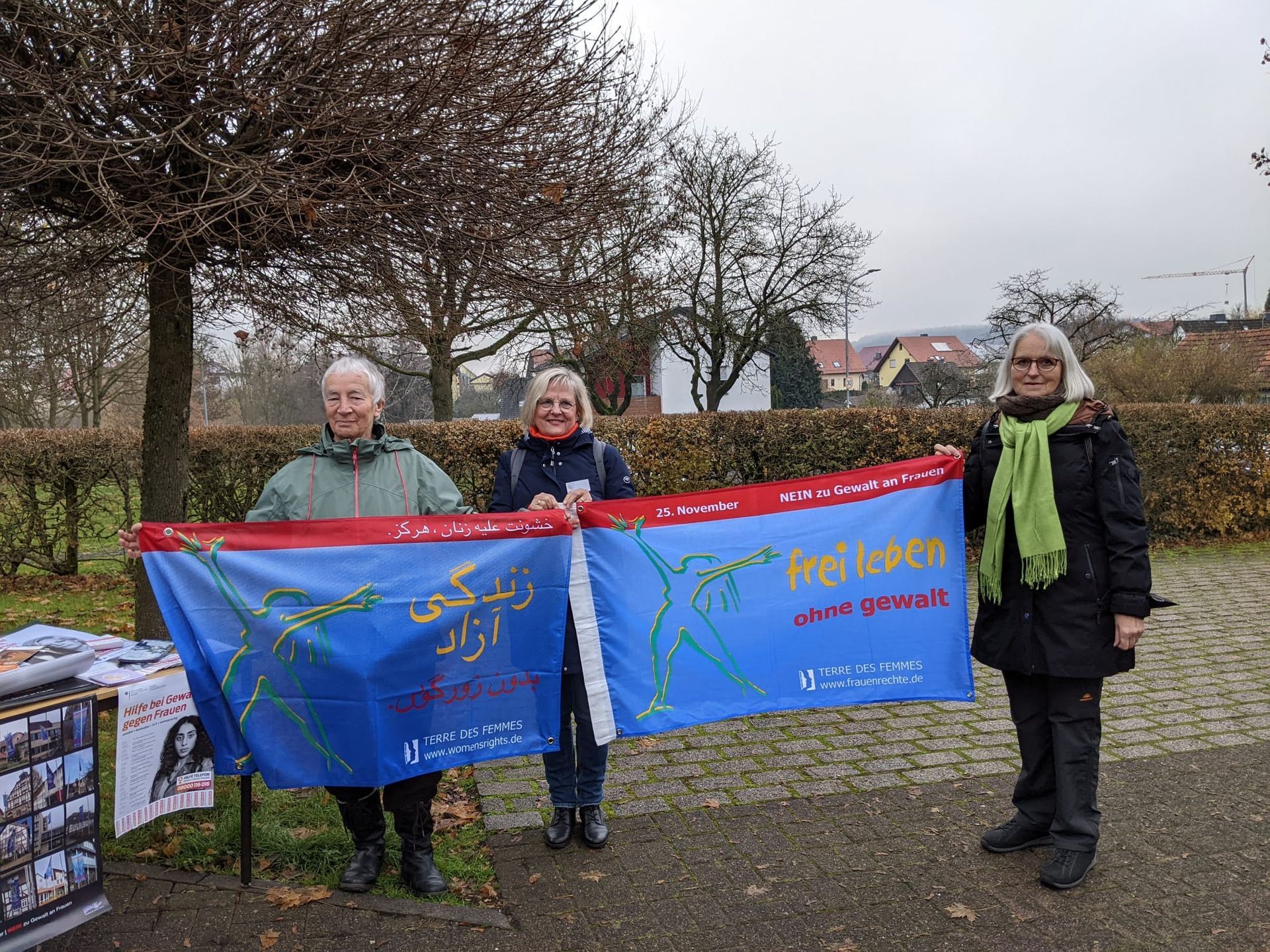Elisabeth Plock, Maria Weber und Karin Glathe vertraten Frauennetzwerk in Gilserberg, im Gepäck hatten sie neben dem deutschen Banner, auch eines auf Persisch.