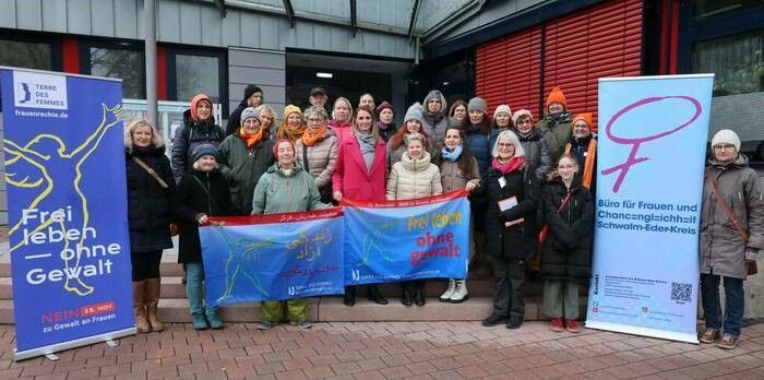 Am 25. November 2024 haben Dagmar Becker und Maria Weber vom Frauennetzwerk gemeinsam mit den Mitarbeiterinnen des Frauen- und Gleichstellungsbüros und rund 50 engagierten Frauen und Männern ein deutliches Zeichen gegen Gewalt an Frauen gesetzt. Unter dem Motto „Frei leben, ohne Gewalt“ trafen wir uns in Wasenberg im südlichen Schwalm-Eder-Kreis, um unsere Solidarität zu zeigen und auf dieses wichtige Thema aufmerksam zu machen. Die Veranstaltung wurde durch Bürgermeister Luca Fritsch eröffnet. Im Anschluss sprach Bärbel Spor vom Frauen- und Gleichstellungsbüro über die Bedeutung des Mottos und der Veranstaltung. Danach begrüßte Maria Weber die Anwesenden im Namen des Frauennetzwerk Schwalm-Eder e.V. und stellte kurz unsere Arbeit und Ziele vor. Gemeinsam mit unserem Transparent haben wir ein starkes, sichtbares Zeichen gegen Gewalt an Frauen gesetzt. Die gelungene Veranstaltung zeigte, wie wichtig und kraftvoll ein gemeinsames Engagement in der Region ist.